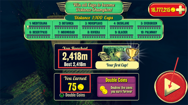 4、赛程结束后获得【2,418m】最佳成绩与75金币,继续挑战解锁【MEDITERANA】等杯赛,向距离冠军迈进。