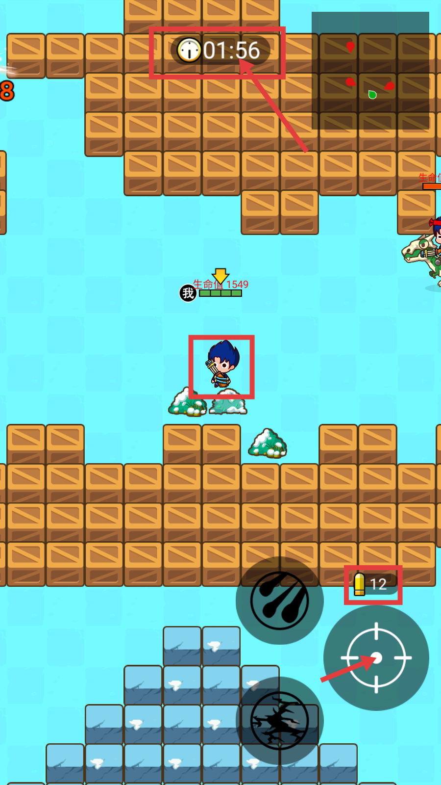 2、关注时间(如01:56)和子弹数量(如12发),操控角色移动,利用瞄准按钮攻击敌人,同时留意自身生命值(如1549)。