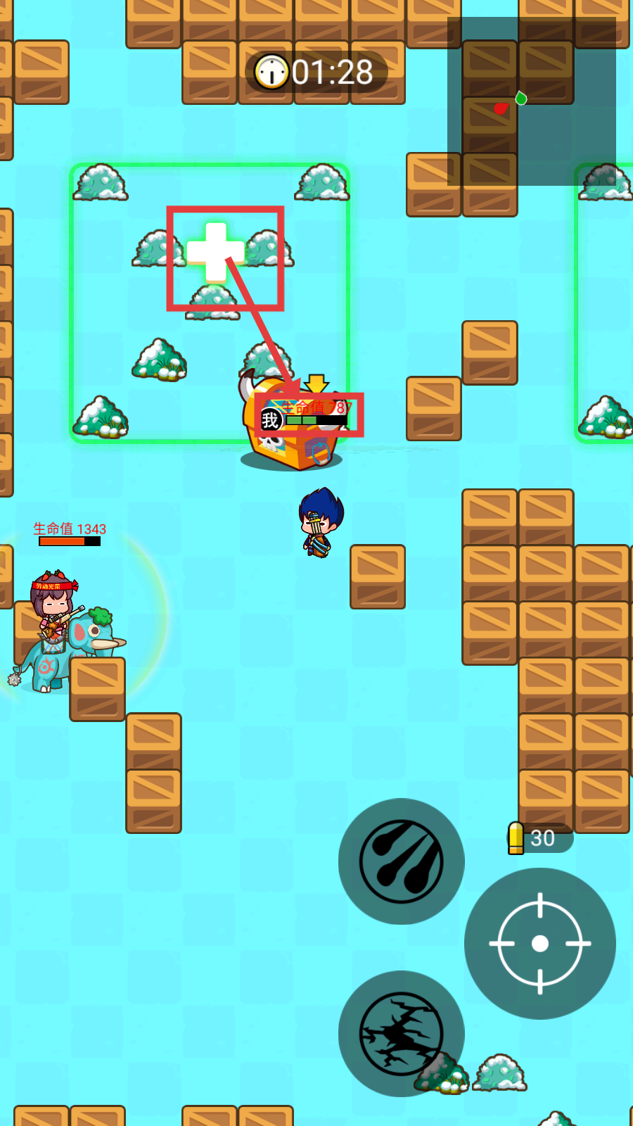 3、遇到回血道具(十字标识)时,及时靠近恢复生命值,保障战斗续航能力。