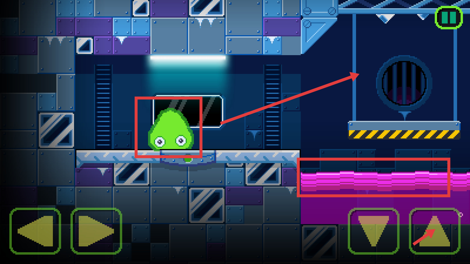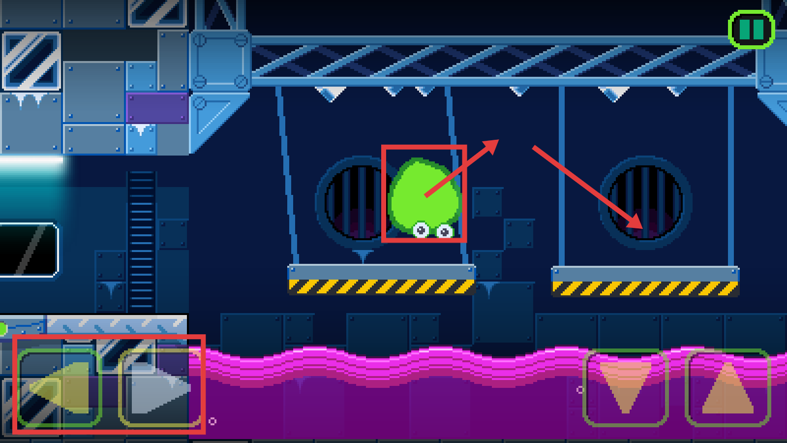 1、操控绿色史莱姆,利用左右移动按钮,避开【粉色-区域】,向目标区域移动,探索关卡路径。