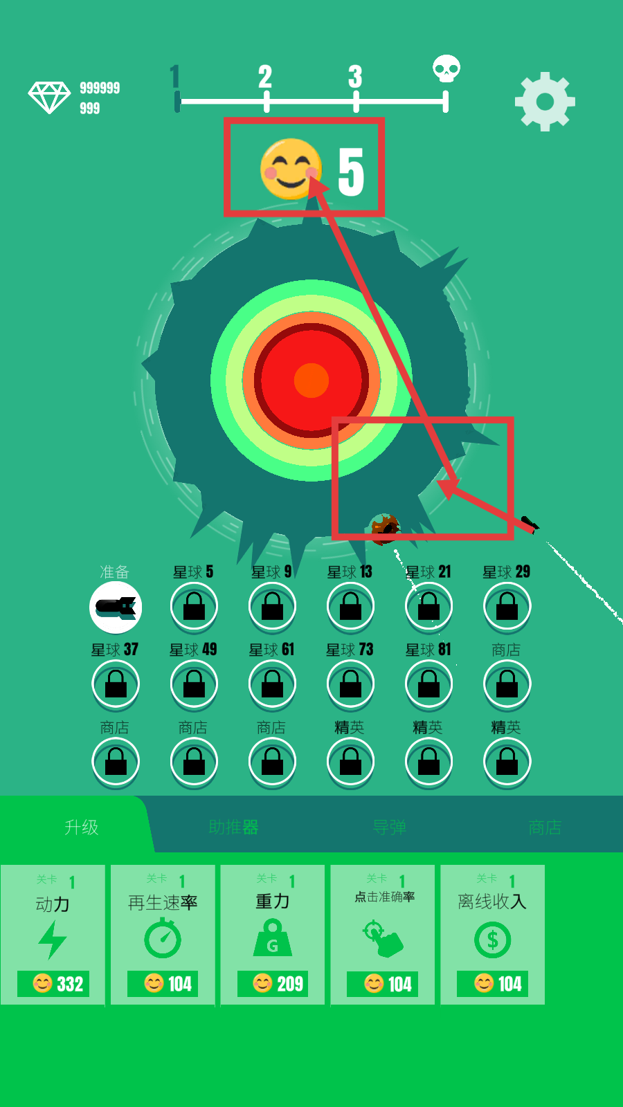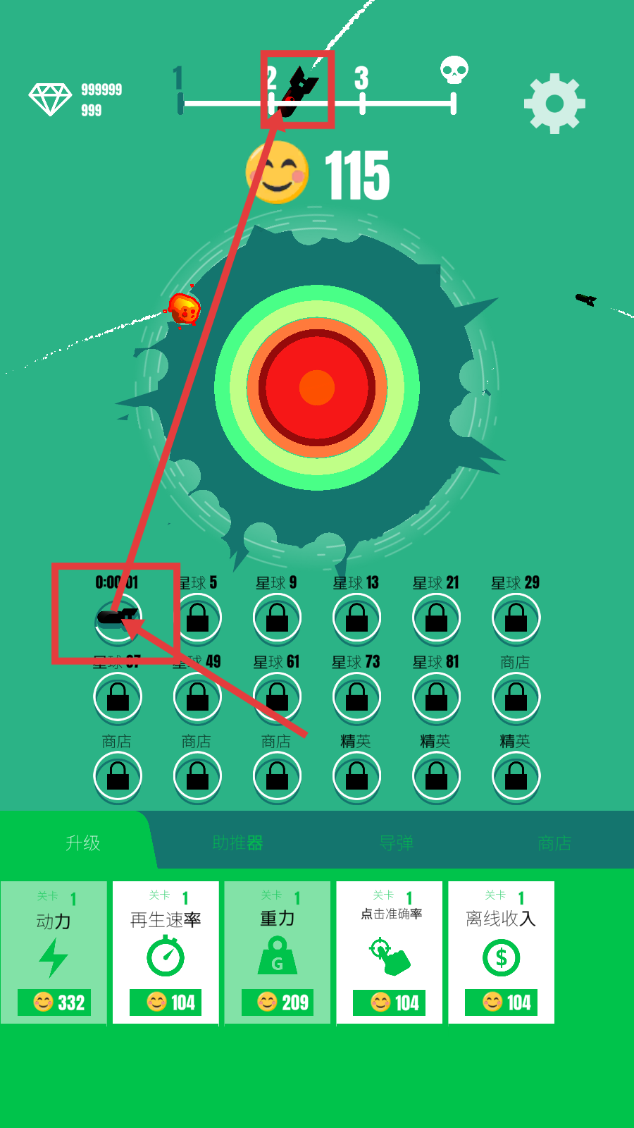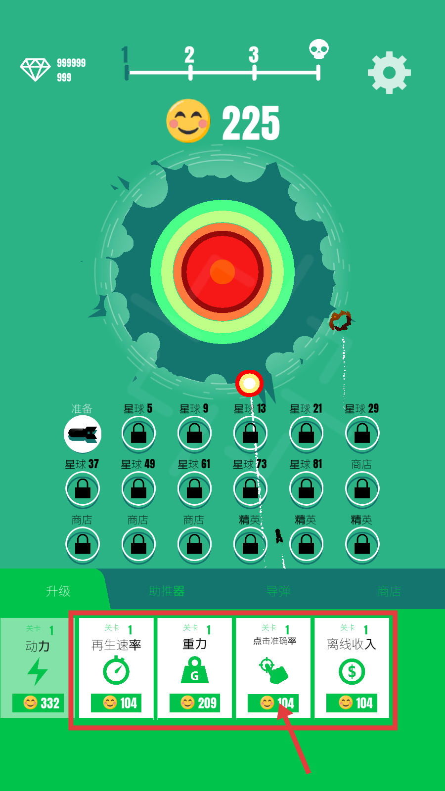 3、升级【再生速率】【重力】【点击准确率】等属性,提升游戏能力,助力关卡挑战。