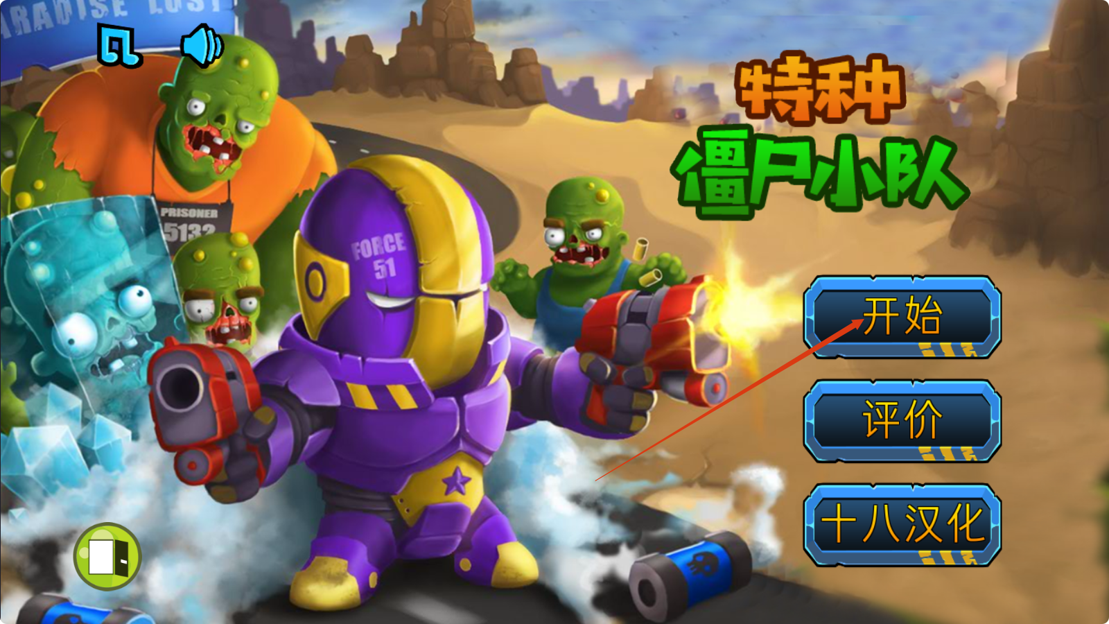 1、进入【特种僵尸小队】游戏,点击【开始】按钮,开启僵尸射击挑战,准备在关卡中用武器对抗各类僵尸。