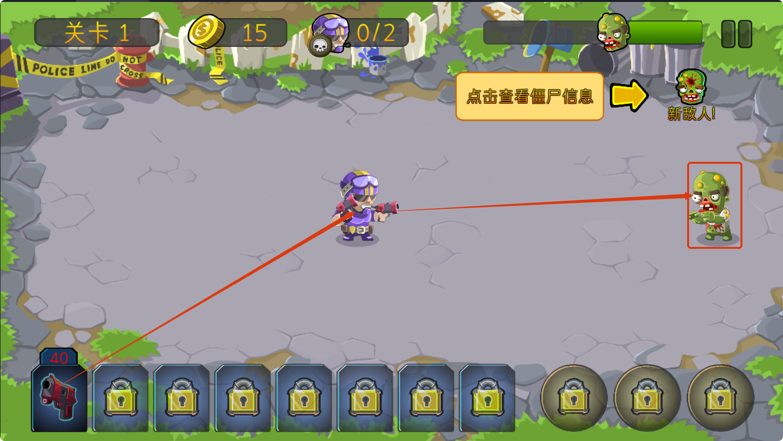 2、关卡1中瞄准【新敌人-僵尸】射击,点击查看僵尸信息,利用武器【40】伤害值有效打击,熟悉敌人属性。
