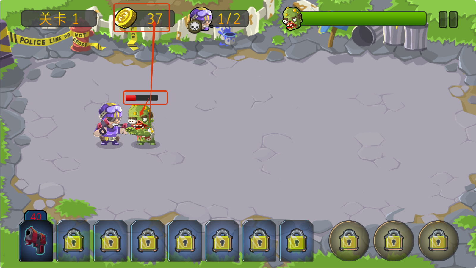 3、战斗时持续攻击僵尸,积累【金币-37】等资源,留意僵尸血量条,精准攻击以高效消灭敌人获取更多奖励。