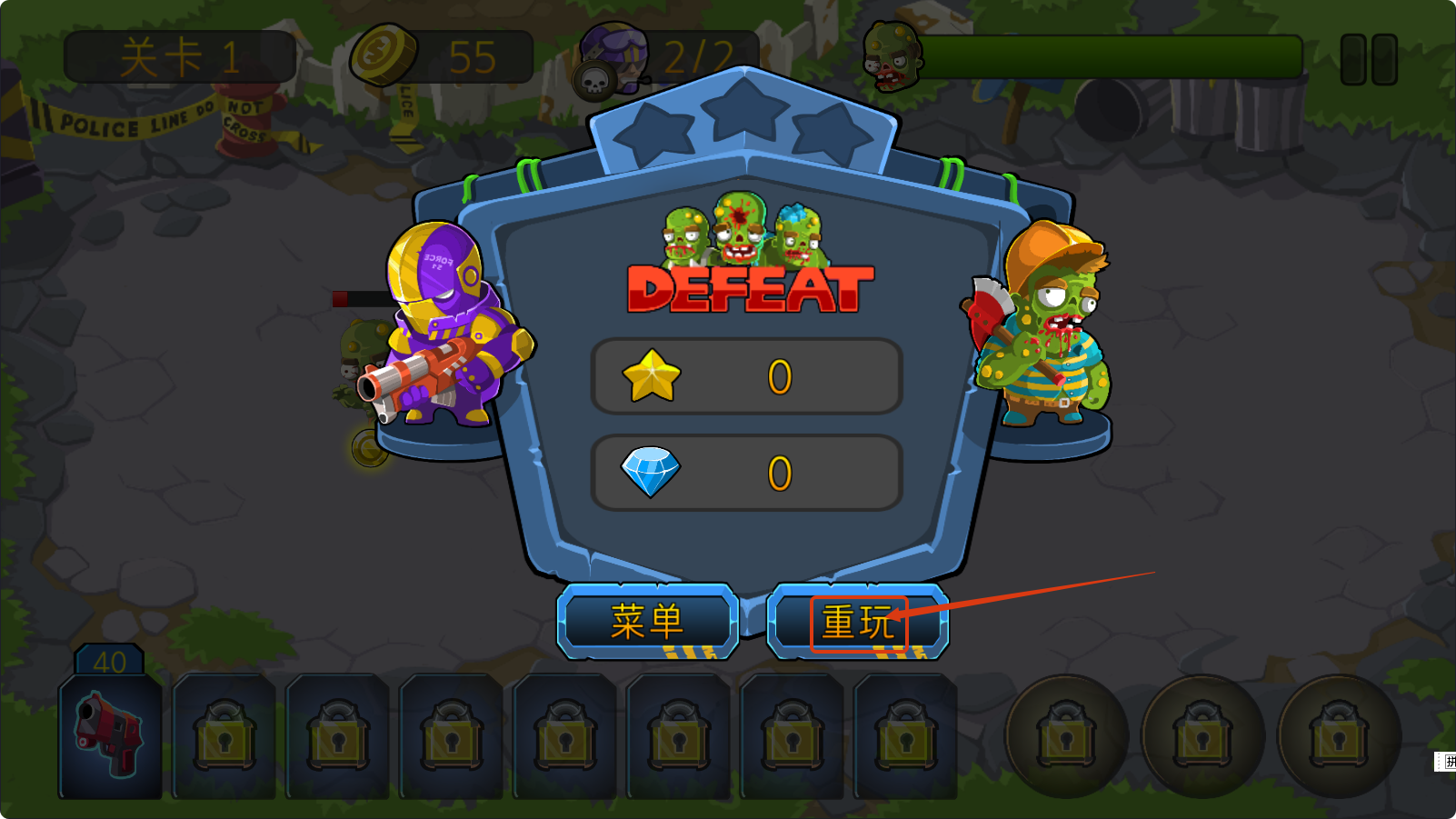 4、若战斗失败,点击【重玩】按钮重新挑战关卡,调整攻击策略,争取消灭所有僵尸,获取星级和钻石奖励。