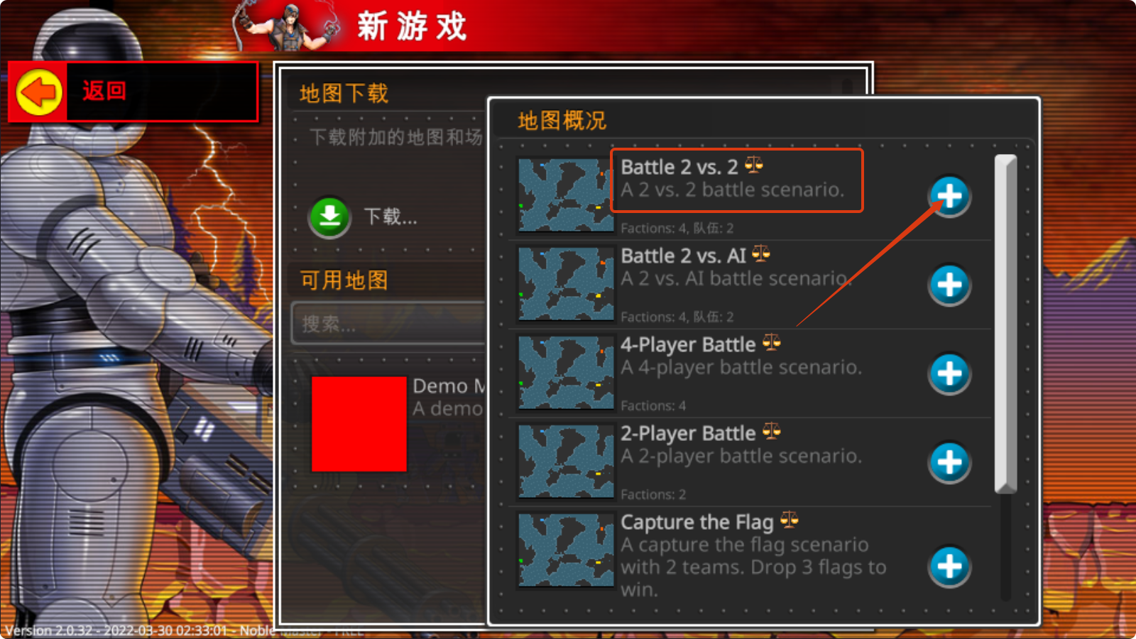 1、在新游戏地图选择中,可添加【Battle-2-vs.-2】地图,该地图是2对2的对战场景,选择后开启对应战局。