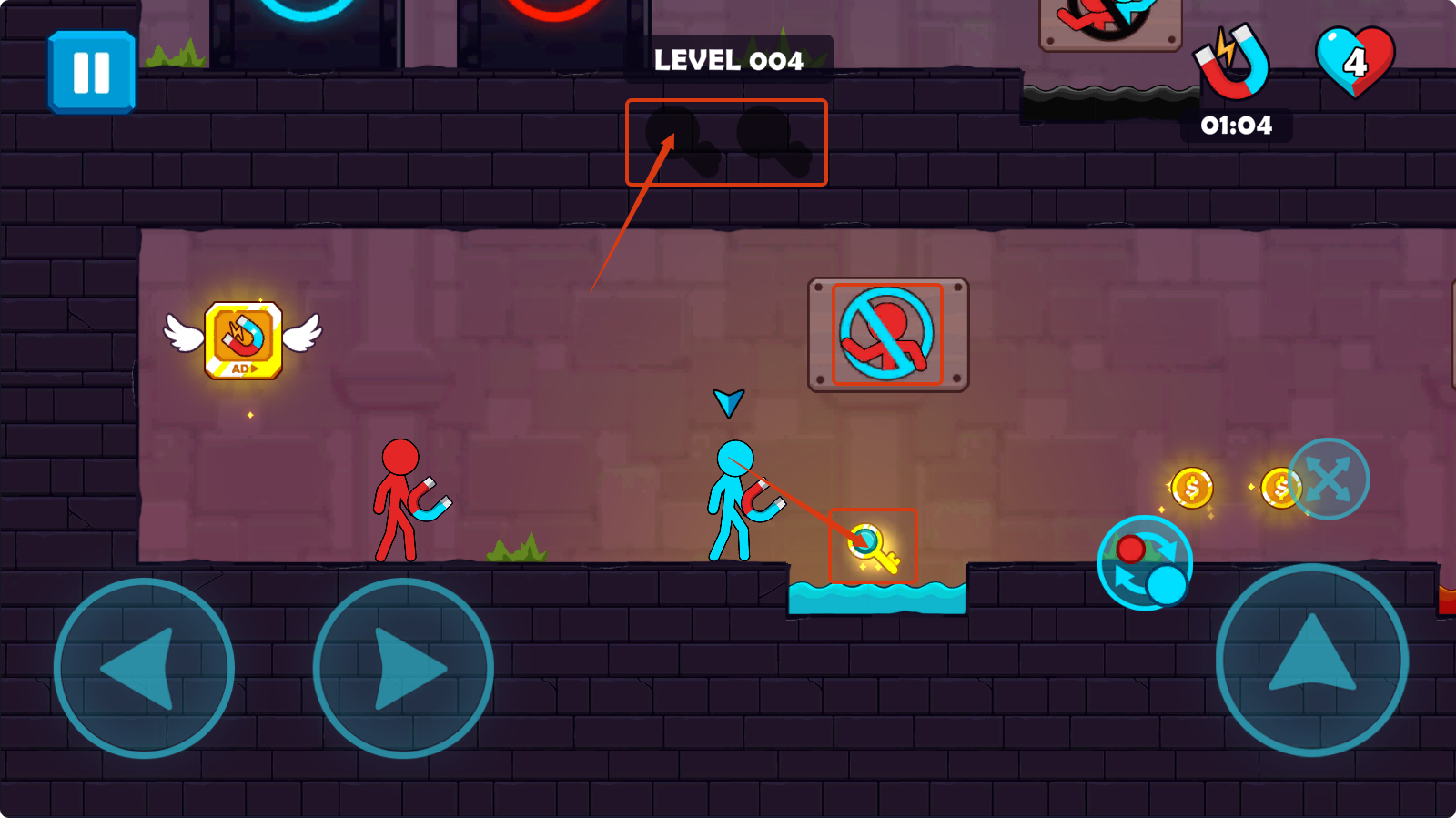 2、在LEVEL-004中,操控小人收集【钥匙】,留意场景中的禁止标识,利用磁铁道具辅助收集,推进关卡。