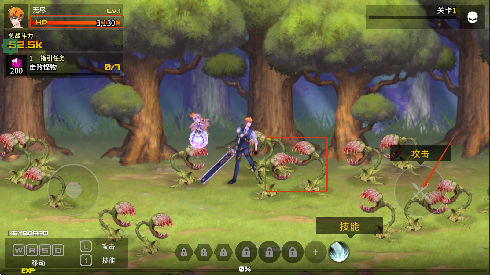2、在关卡1,关注【HP-3,130】,点击【攻击】按钮,消灭周围怪物,推进关卡进程。