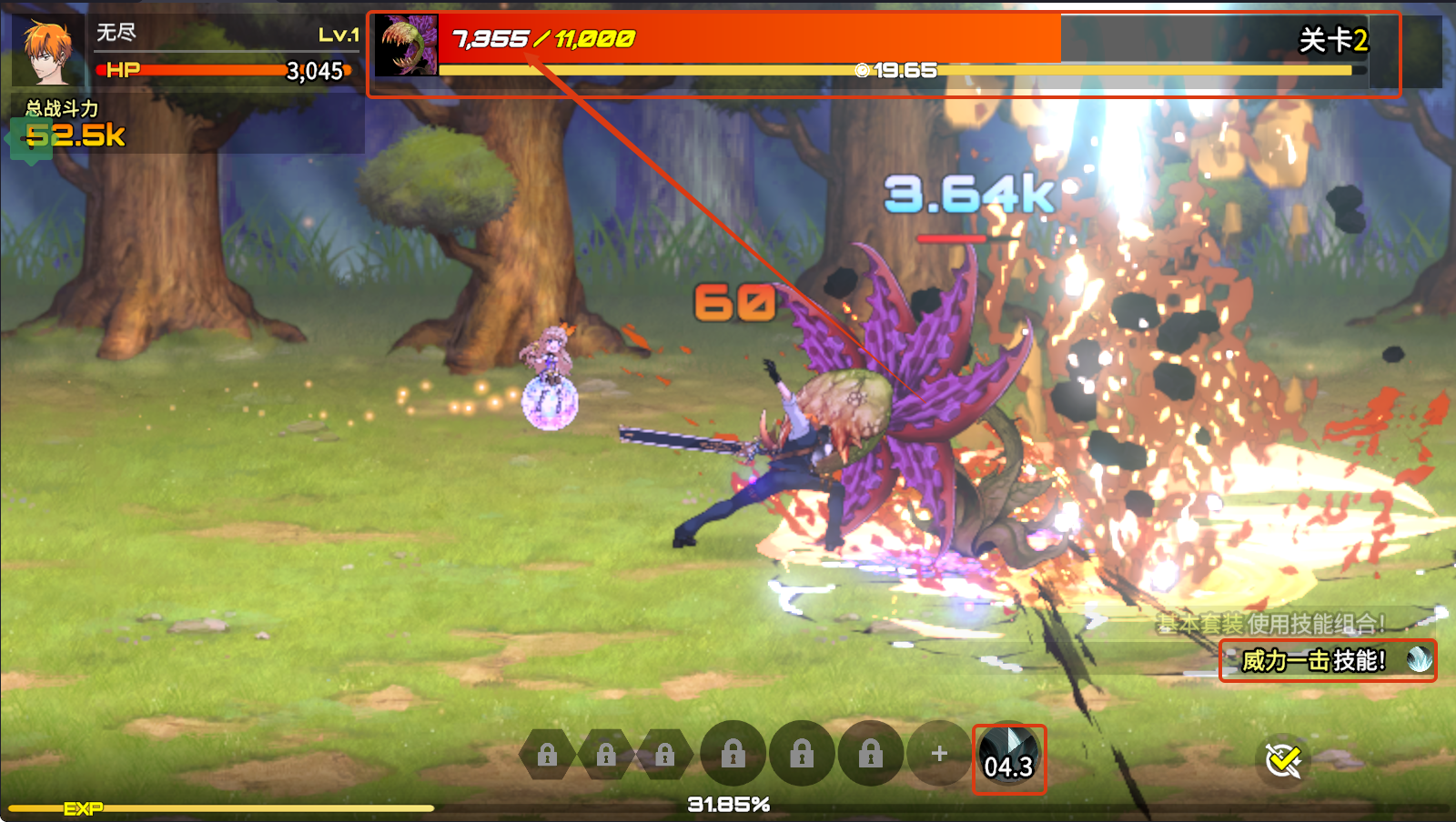 3、在关卡2的BOSS战中,利用【威力一击技能】,瞄准BOSS【7,355/11,000-HP】,打出高额伤害快速通关。