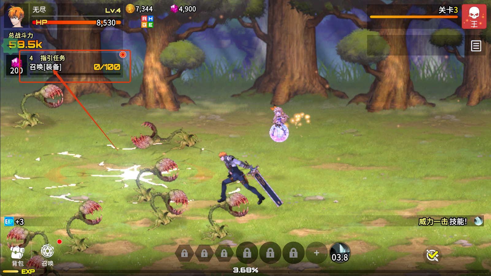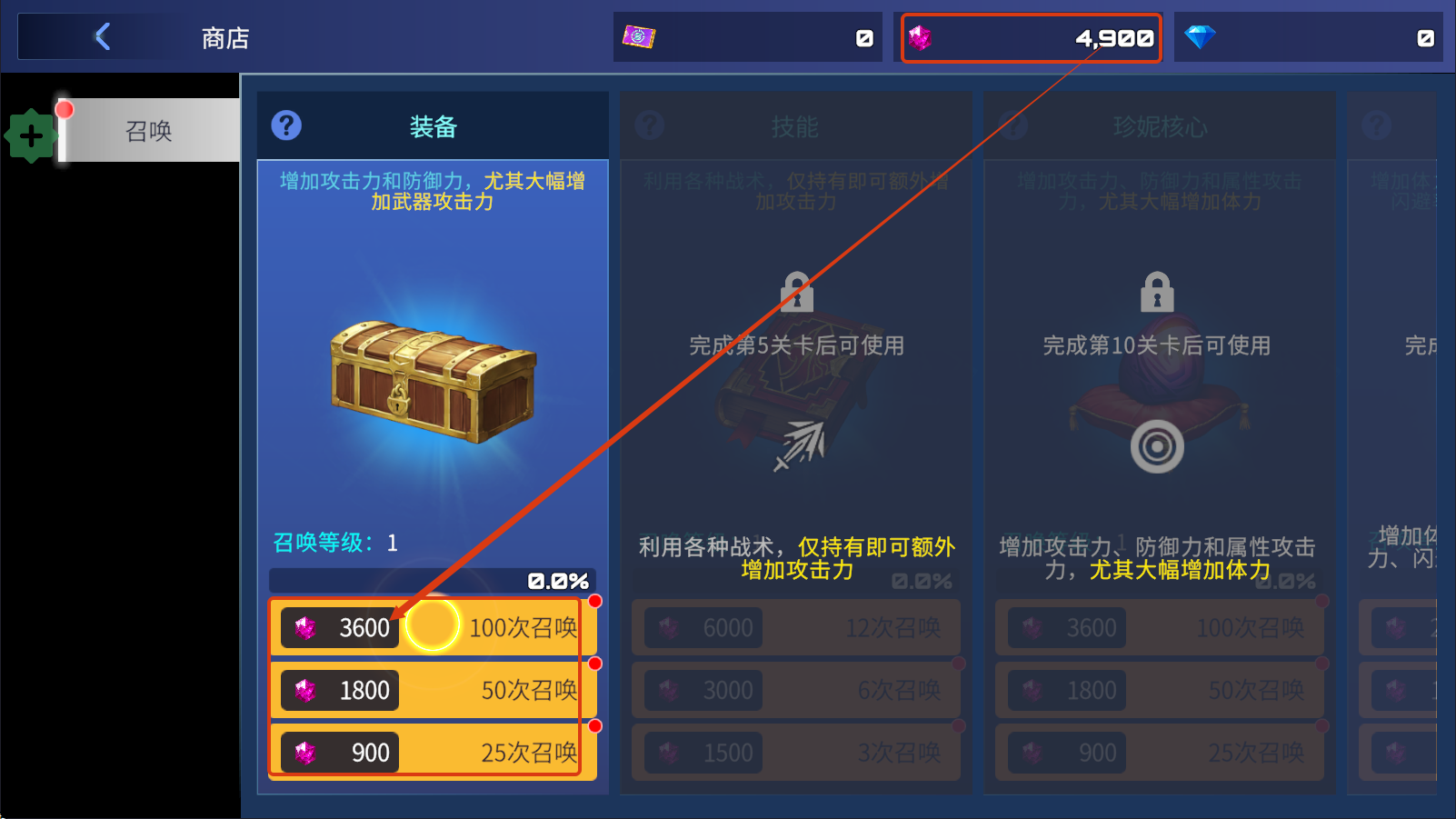 2、在商店装备召唤界面,消耗【粉钻-3600】进行100次召唤,获取装备以提升战力。