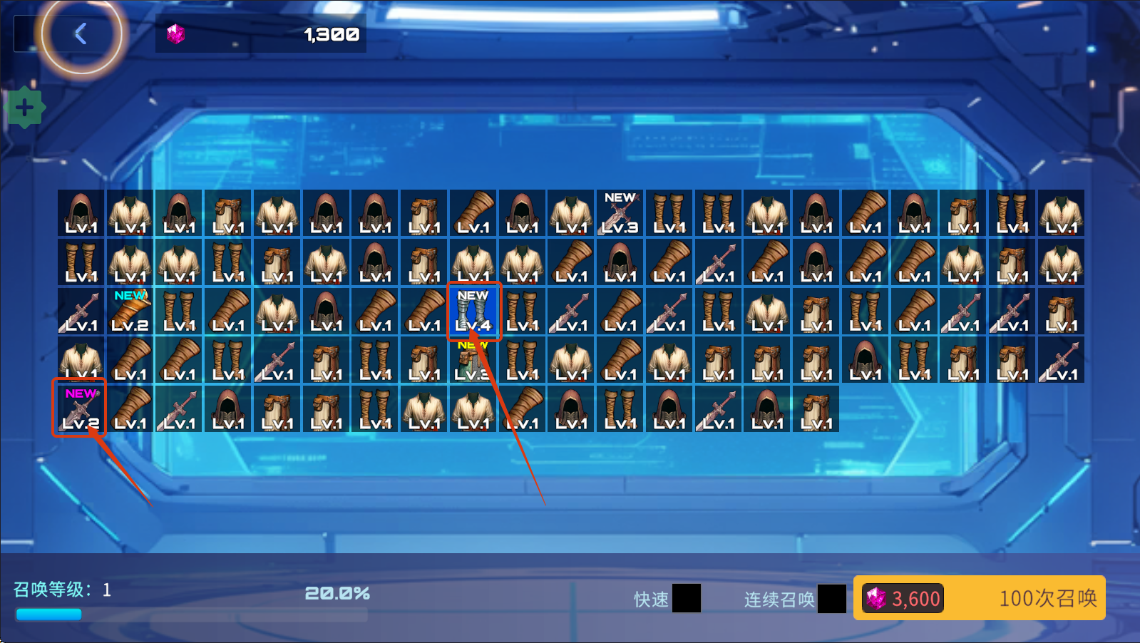 3、召唤后可获得【LV2】【LV4】等不同等级装备,收集这些装备以丰富装备库。