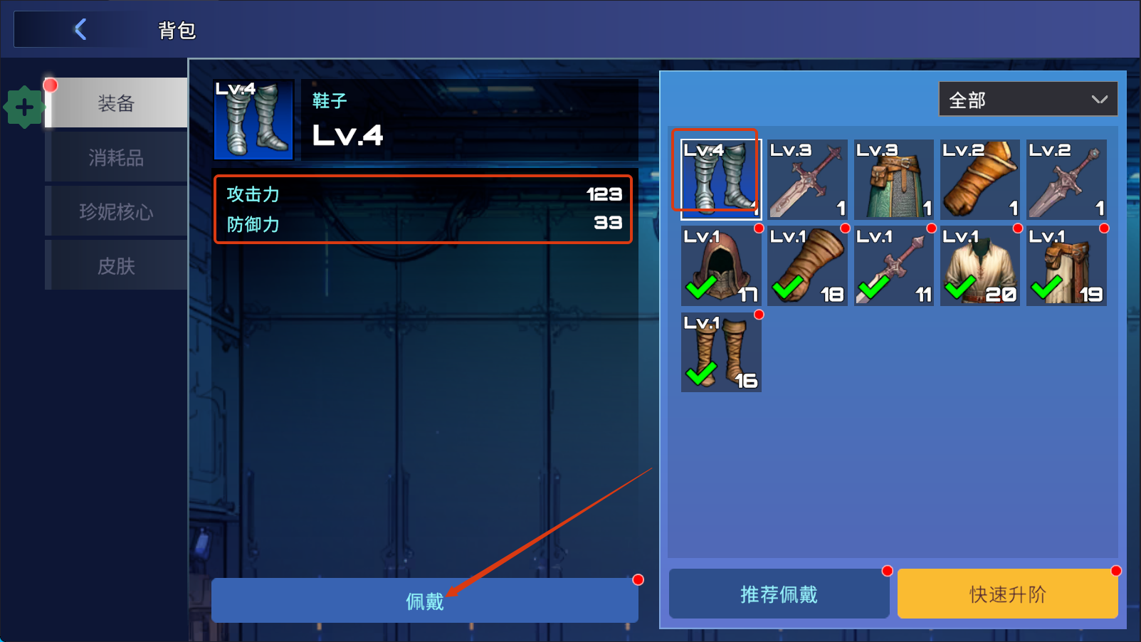 4、在背包中选择高等级装备如【LV4-鞋子】,点击【佩戴】,提升攻击力和防御力,增强角色战力。