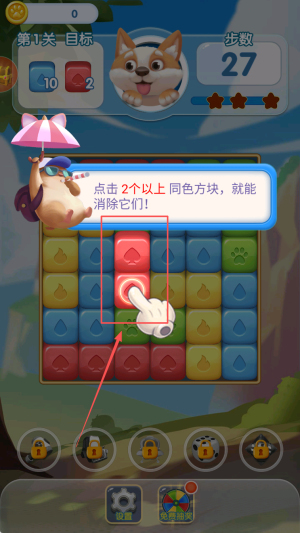 2、接着,查看第1关目标:27步内点击2个以上同色方块即可消除。