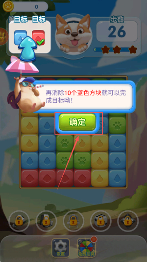 3、然后,按提示再消除10个蓝色方块,点击“确定”继续。