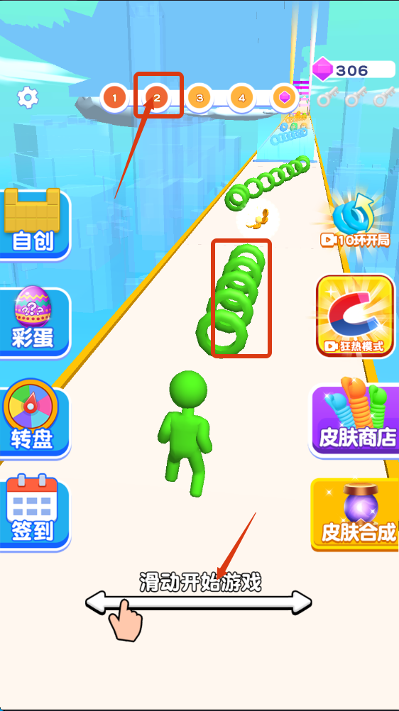1、滑动开始游戏后,关注阶段【2】,优先收集【绿色-圆环】,同时留意左侧【自创】【彩蛋】等功能,为游戏做好准备。