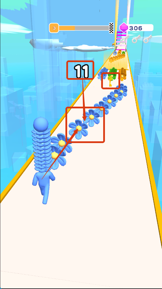 2、在赛道上收集【蓝色-花朵】,积累数量(当前显示【11】),同时别忘了拾取【黄色-钥匙】,助力通关和资源积累。