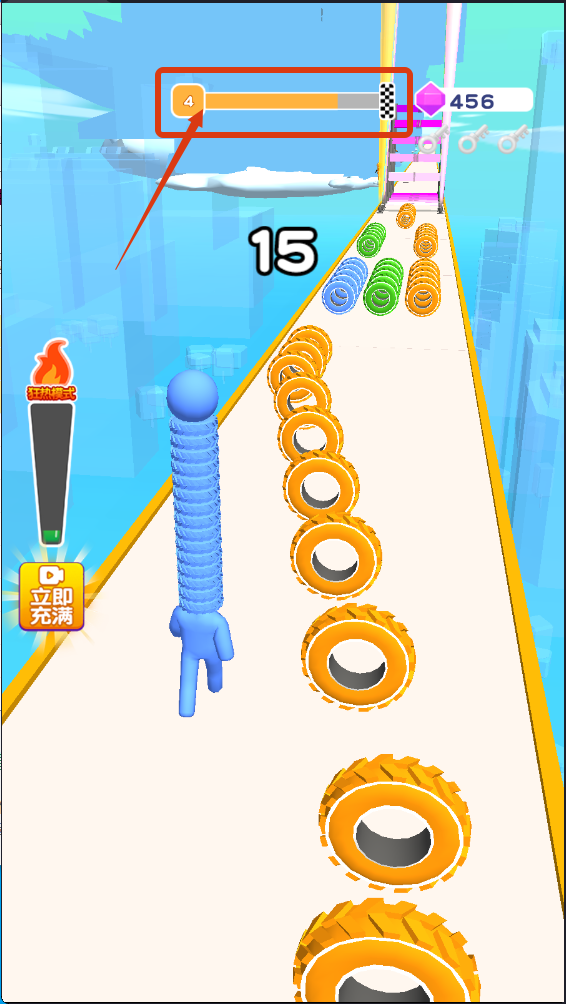 3、进入阶段【4】后,大量收集【橙色-圆环】,还可利用【狂热模式】提升效率,快速积累分数和资源。