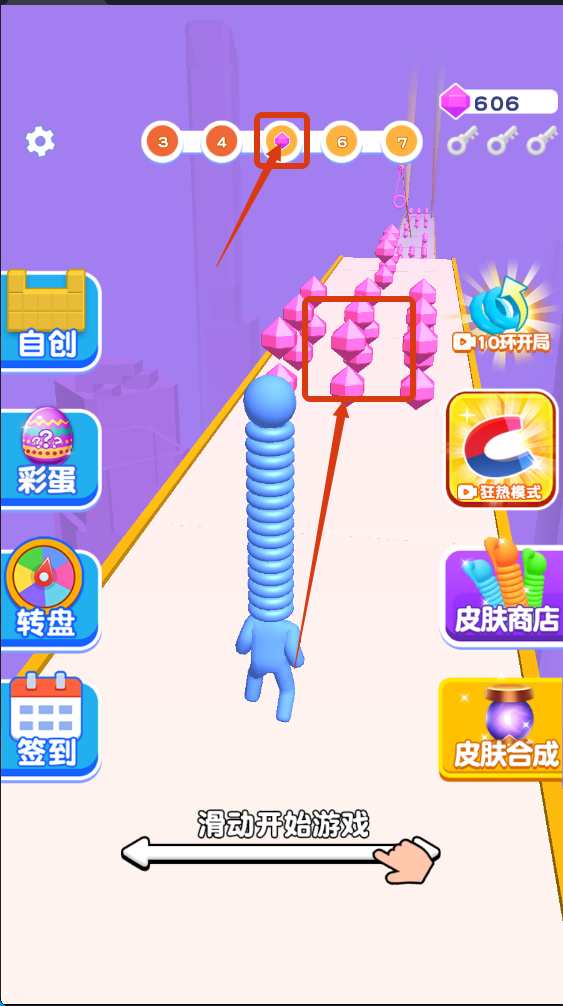1、滑动开始游戏后,关注阶段【5】,优先收集【粉色-晶体】,同时留意左侧【自创】【彩蛋】等功能入口,为游戏做好准备。