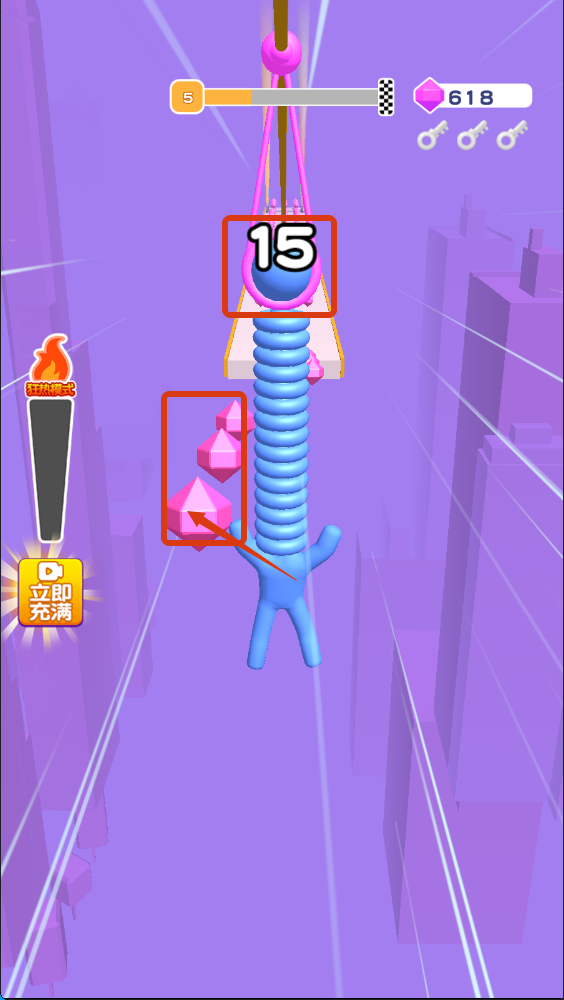2、在阶段【5】中,收集【粉色-晶体】(当前显示【15】),可利用【狂热模式】提升收集效率,助力资源积累。