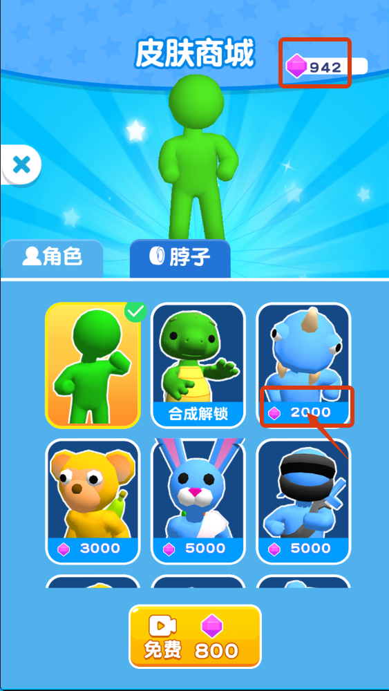 4、在皮肤商城中,积累钻石(当前【942】)可解锁不同角色,如需要【2000-钻石】的蓝色角色,积累钻石提升游戏体验。