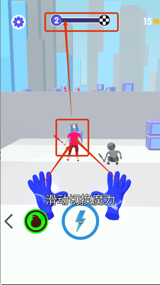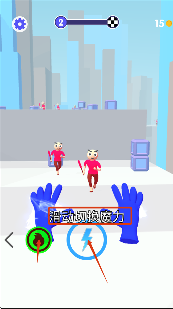 2、滑动切换魔力(如【闪电】),应对敌人并收集金币(当前【15】),积累资源提升战力。