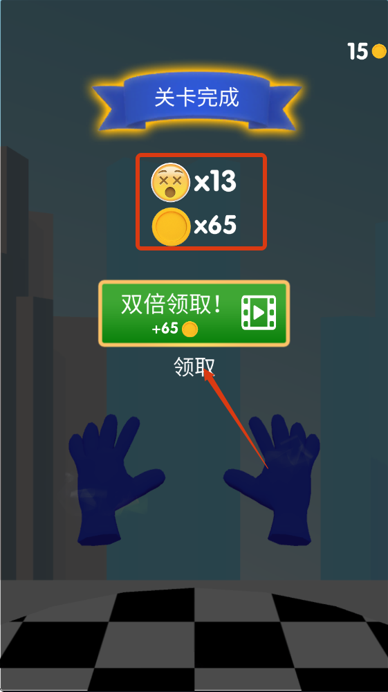 4、关卡完成后点击【领取】,获得【×65-金币】和【×13-击败奖励】,也可选择双倍领取来增加资源。