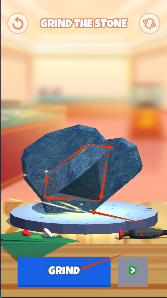 2、在【GRIND-THE-STONE】阶段,点击【GRIND】按钮打磨原石,按照指引塑造宝石雏形,为后续加工做准备。