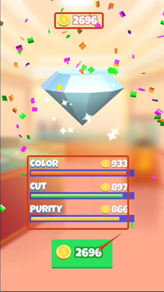 4、制作完成后,根据【COLOR】【CUT】【PURITY】的评分,领取【2696-金币】奖励,积累金币可用于解锁更多制作内容。
