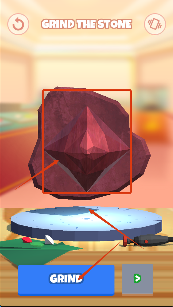 2、在【GRIND-THE-STONE】阶段,点击【GRIND】按钮打磨原石,按照指引塑造宝石雏形,为后续加工做准备。