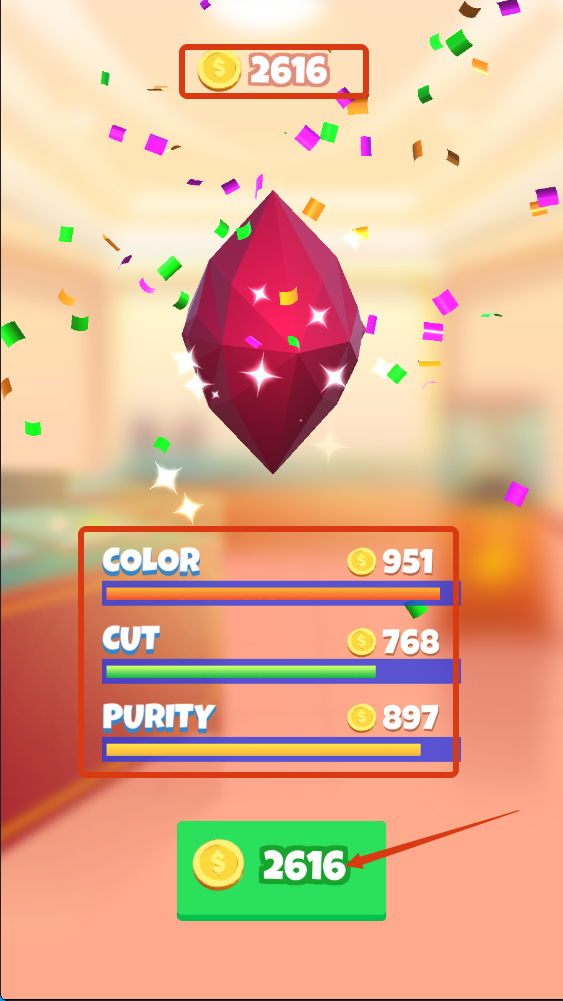 4、制作完成后,根据【COLOR】【CUT】【PURITY】的评分,领取【2696-金币】奖励,积累金币可用于解锁更多制作内容。