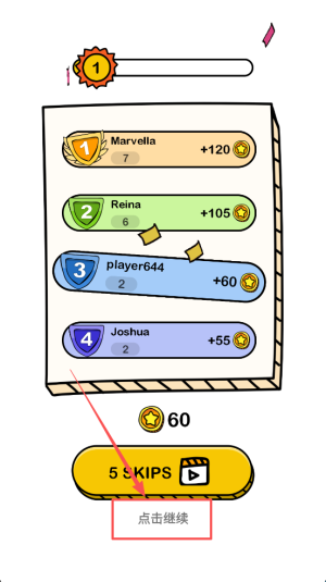 4、最后,查看结果并点击“点击继续”按钮进行下一轮游戏或查看排行榜。