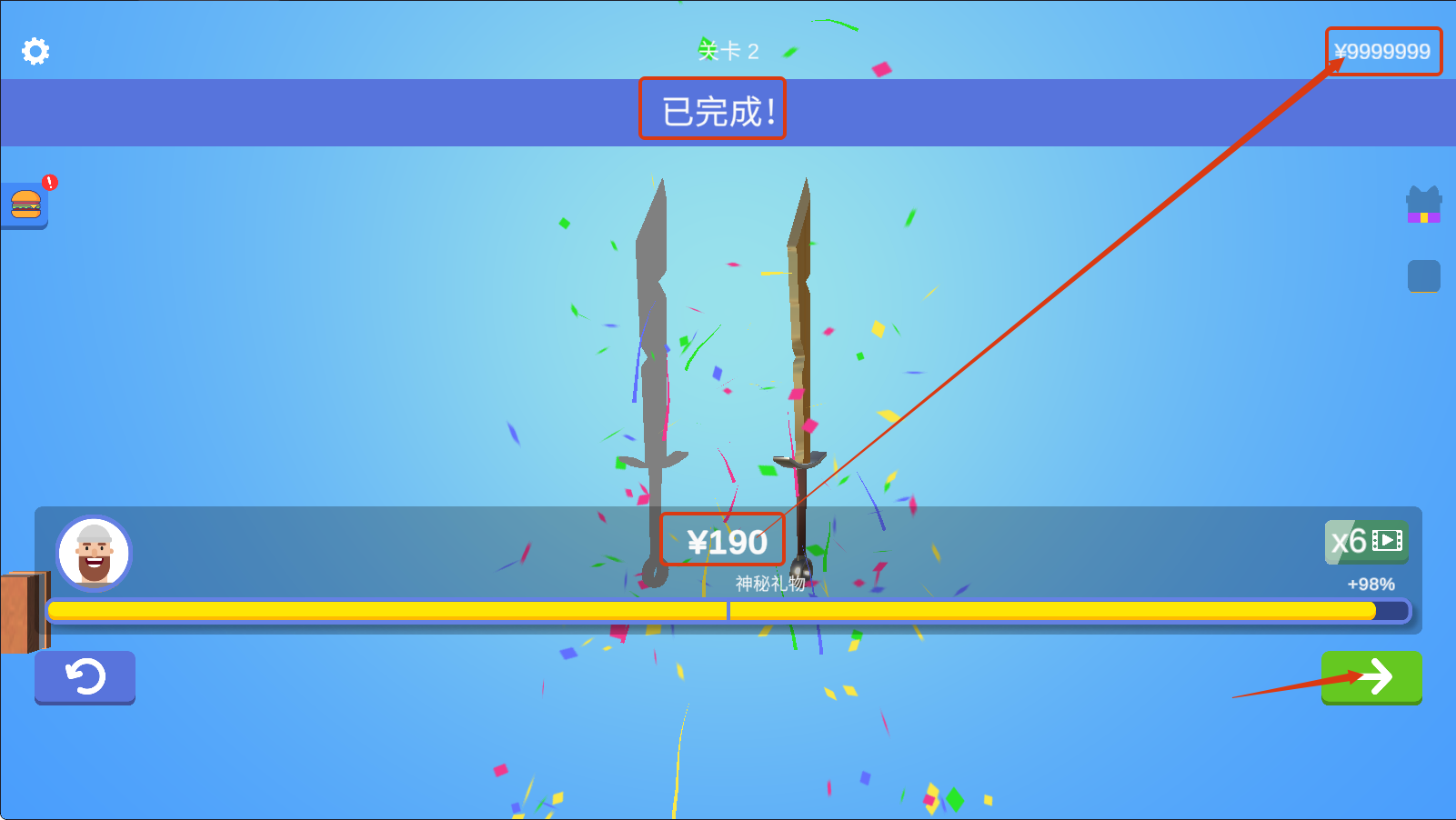 4、完成制作后,获得¥190报酬,积累的资金(当前¥9999999)可用于解锁更多工具或关卡,点击箭头进入下一关,持续提升制作技能。