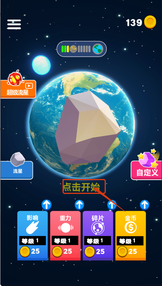 1、点击【开始】进入游戏,可消耗金币升级【影响】【重力】【碎片】【金币】等属性,提升流星撞击效果,可优先选择关键属性升级。