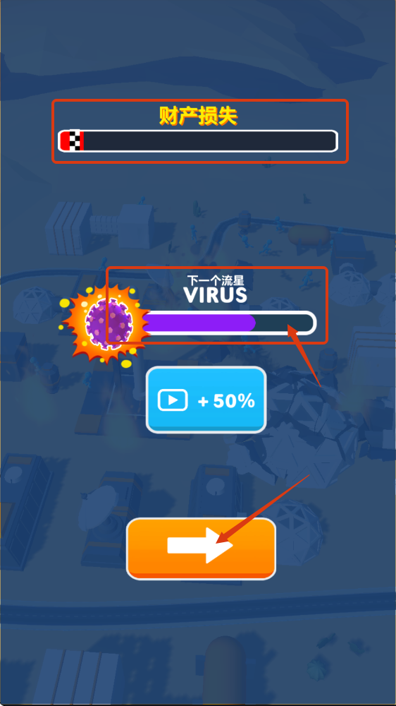 4、撞击结束后,查看【财产损失】进度,了解下一个流星(如VIRUS)的加载情况,点击箭头继续游戏,持续解锁新流星类型和场景。