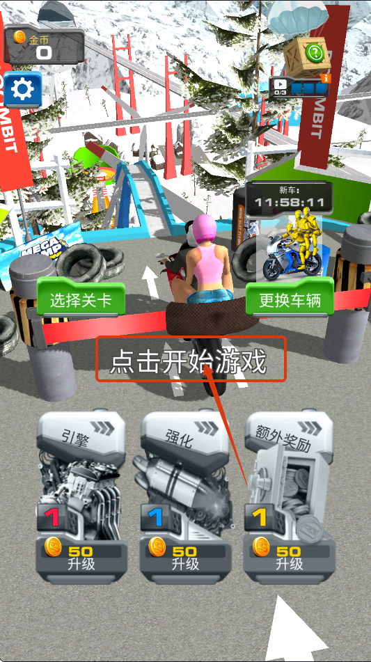 1、先熟悉界面,【点击开始游戏】前可查看【引擎-强化-额外奖励】升级项,虽【金币-0】但了解功能利于后续发展。