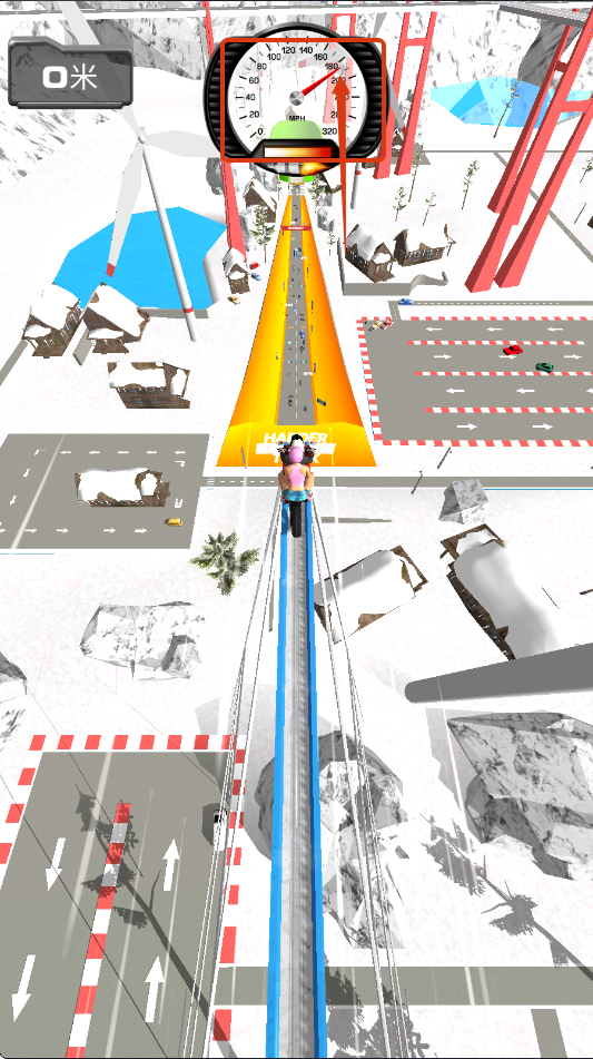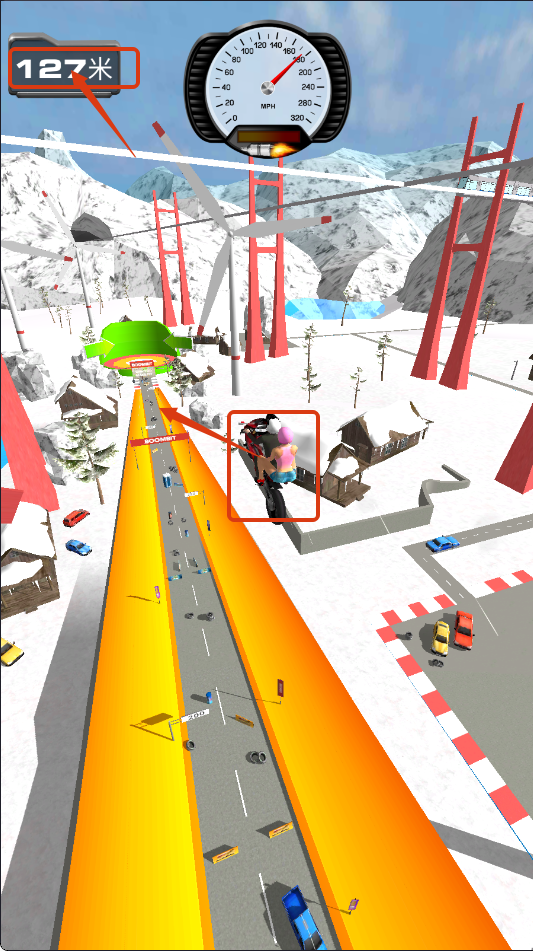 2、游戏开始后关注【时速表】,从【0米】起点出发,沿雪地赛道的黄色加速带行驶,保持速度冲坡。
