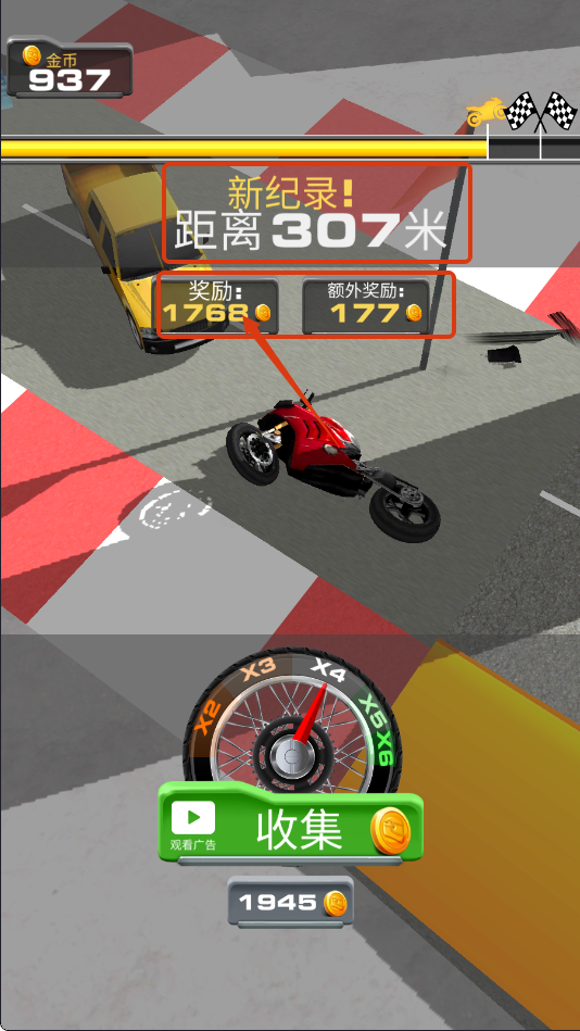 4、挑战结束后,【新纪录!-距离307米】可领取【奖励-1768金币】和【额外奖励-177金币】,积攒金币用于升级车辆或技能。