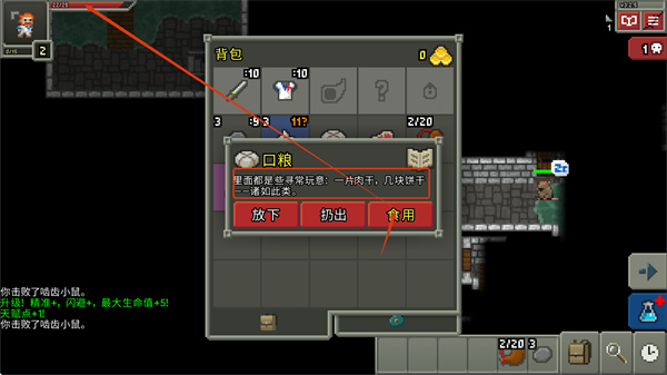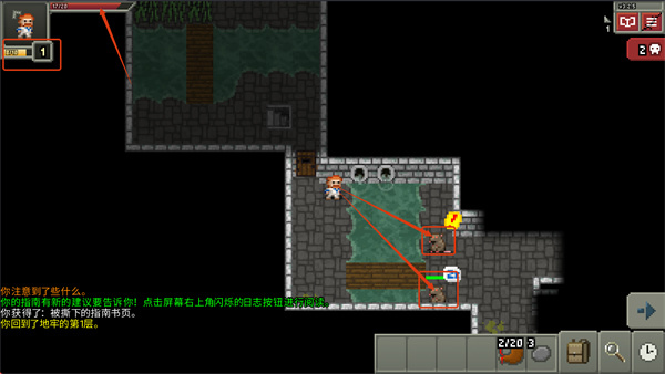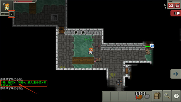 2、回到地牢第1层,关注左上角【等级-1】,击败老鼠类怪物,点击右上角日志按钮查看新建议。