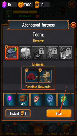 1、进入【Abandoned-fortress】关卡,确认英雄对阵【老鼠-骷髅】敌人,点击【Start】开启战斗,争取获取奖励。