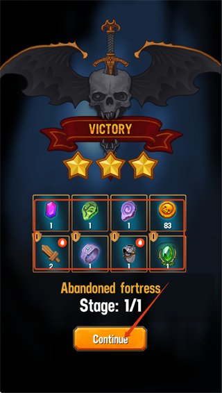 4、胜利后领取【紫色水晶-绿色石块-金币-83】等奖励,点击【Continue】继续冒险,推进游戏进程。