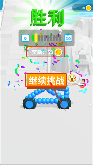 4、胜利后获得【奖励-50金币】,点击【继续挑战】按钮,开启下一轮冒险。