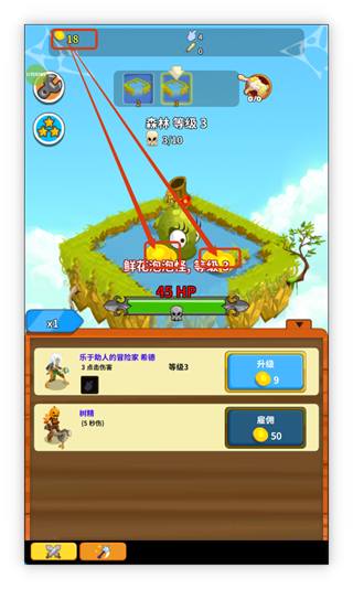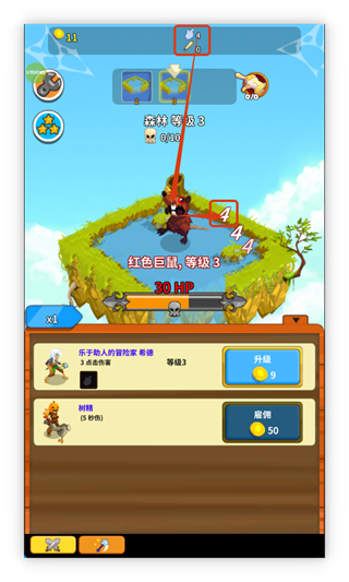 2、攻击【红色巨鼠-等级3】使其HP降至30,同时升级【乐于助人的冒险家-希德】至等级3,提升点击伤害。