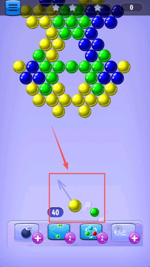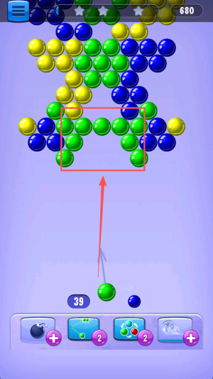 2、接着,观察屏幕上方的泡泡排列,找到可以形成三个或以上同色泡泡的组合。