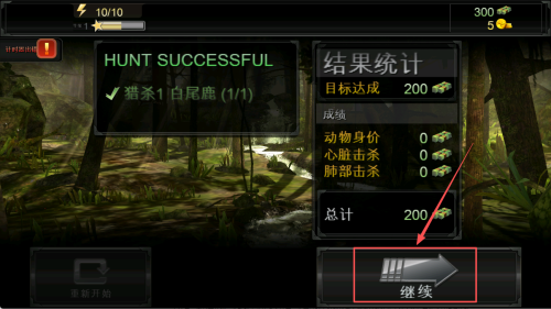 4、如何继续游戏:在任务完成后,查看结果统计,点击“继续”按钮,进行下一阶段的狩猎或返回主菜单。