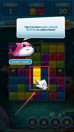 1、开启消除准备:进入游戏后熟悉方块移动规则,明确 “消除方块、击中鲨鱼、寻找宝藏” 的目标,了解随机挑战的机制。