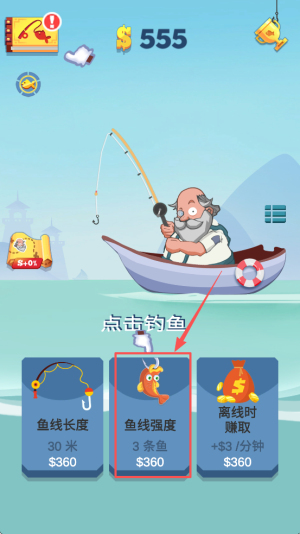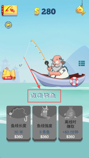 1、开启垂钓准备:进入游戏后熟悉划小船、下鱼钩的操作逻辑,明确 “钓获鱼类、积累积分” 的目标,了解鱼竿基础功能。