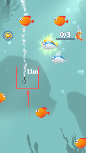 2、接着,拖动屏幕中的鱼线,将鱼钩抛向鱼群。
