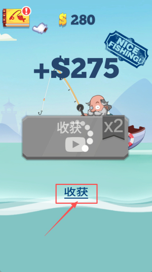 3、然后,当鱼上钩后,点击“收获”按钮收取鱼和奖励。