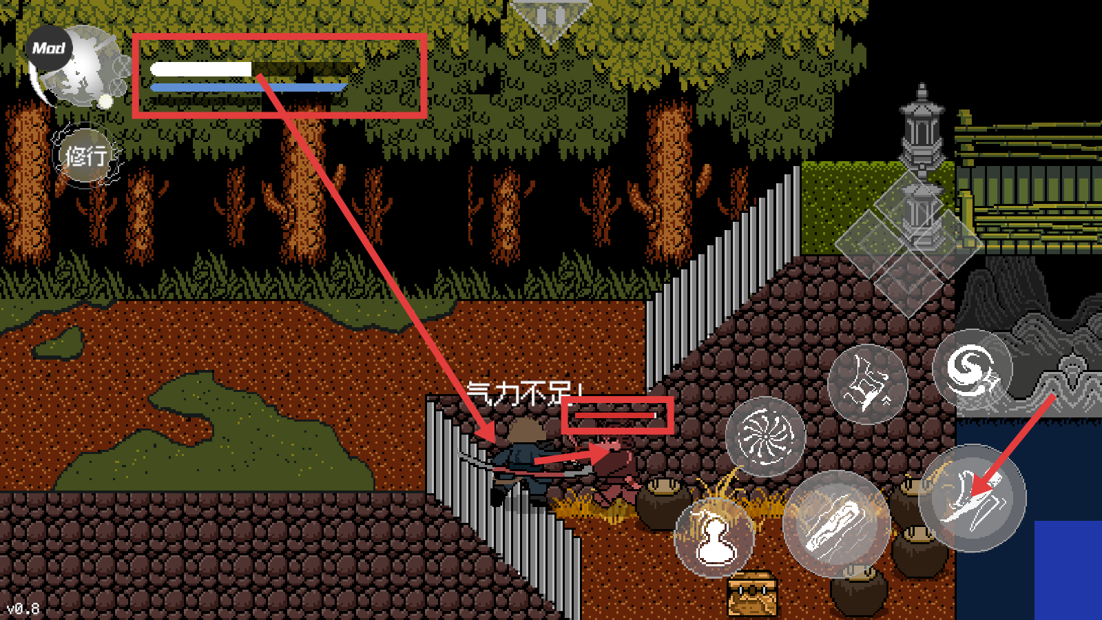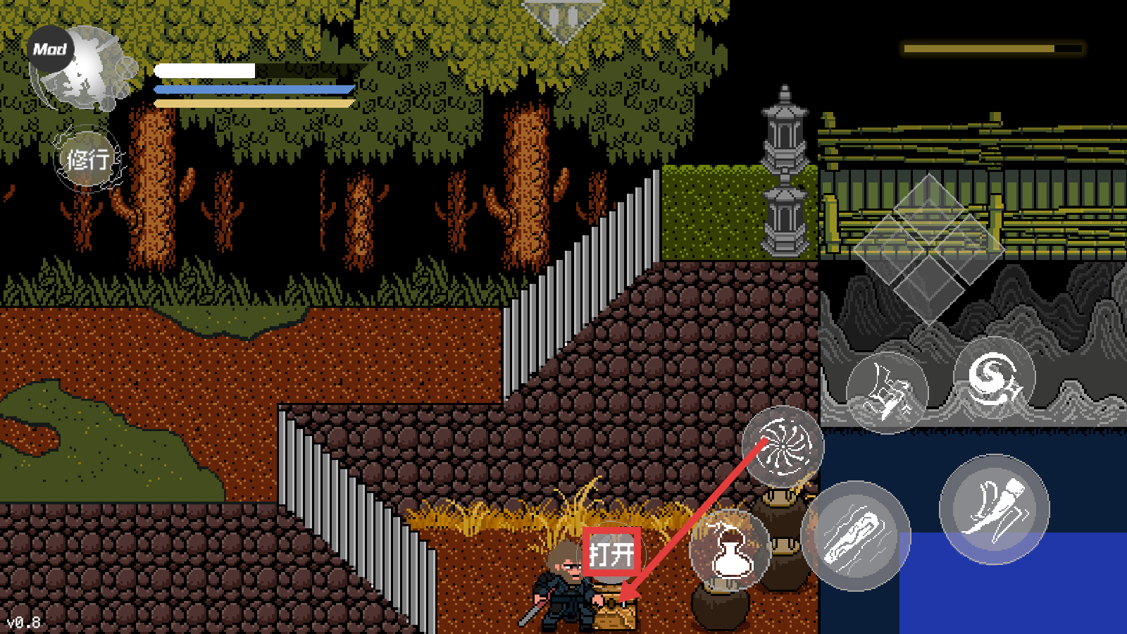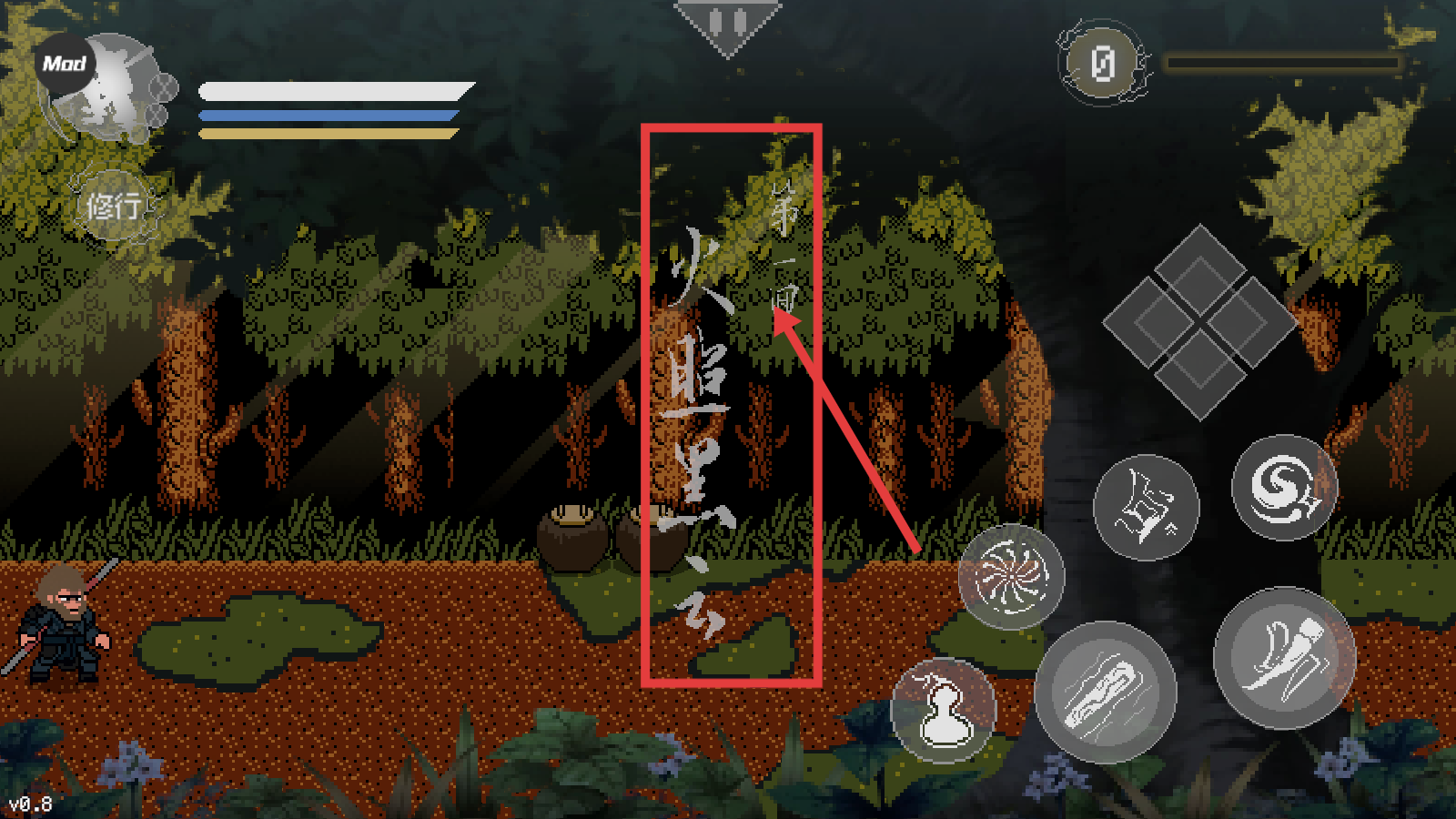 黑神话像素版0.8内置菜单是一款由B站UP主火山哥哥独立创作的同人像素动作冒险游戏,基于黑神话悟空题材进行改编。最新版本集成内置菜单系统,免费提供无敌模式、秒杀功能等MOD选项,大幅简化操作难度。游戏采用复古像素美术呈现西游世界,包含五个主线章节,场景从黑风山延伸到火焰山,BOSS战涵盖黑熊精至牛魔王等经典角色。