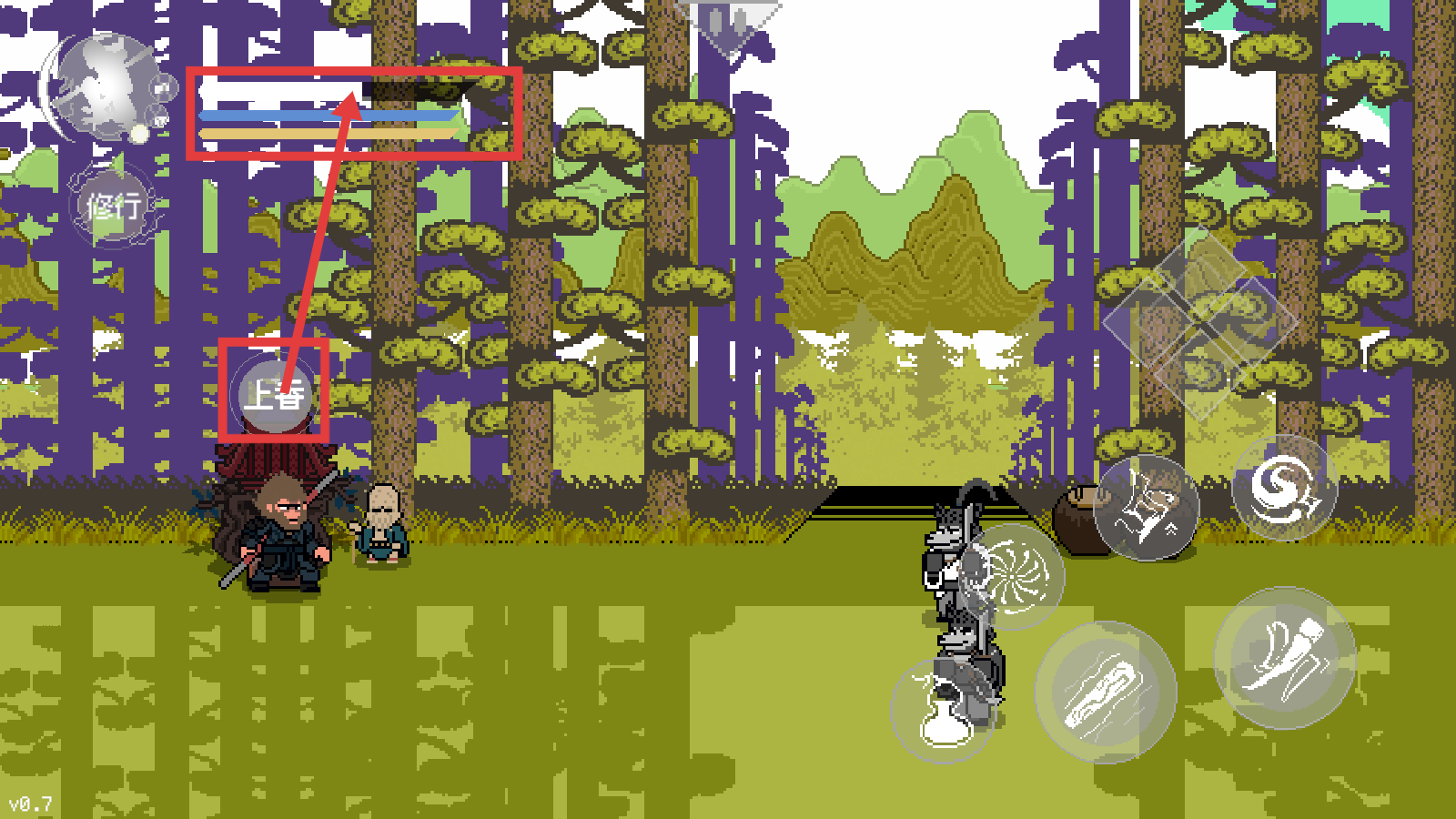 1、点击【上香】,恢复自身状态,为后续战斗与探索做好准备,推进游戏进程。